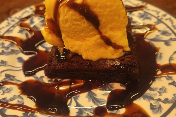 brownie acompanha uma bola de sorvete de creme, nozes e morango