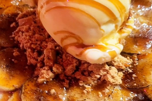 Carpaccio de Banana, cobertas com açucar e caramelizadas com um maçarico, acompanha um sorvete de creme e farofa de paçoca