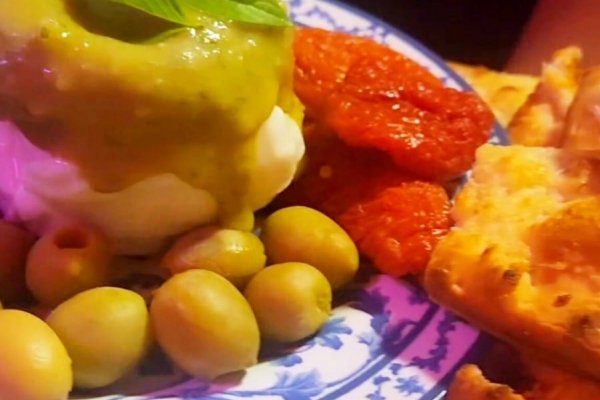 Burrata com molho pesto e manjericao fresco, acompanhada de tomate cereja, azeitonas azapas e torradas