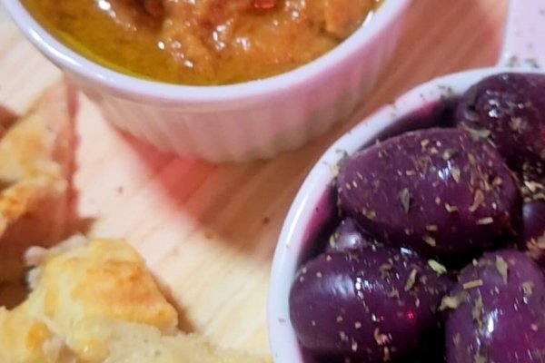 Antepasto de beringelas , acompanhada de azeitonas pretas e torradas